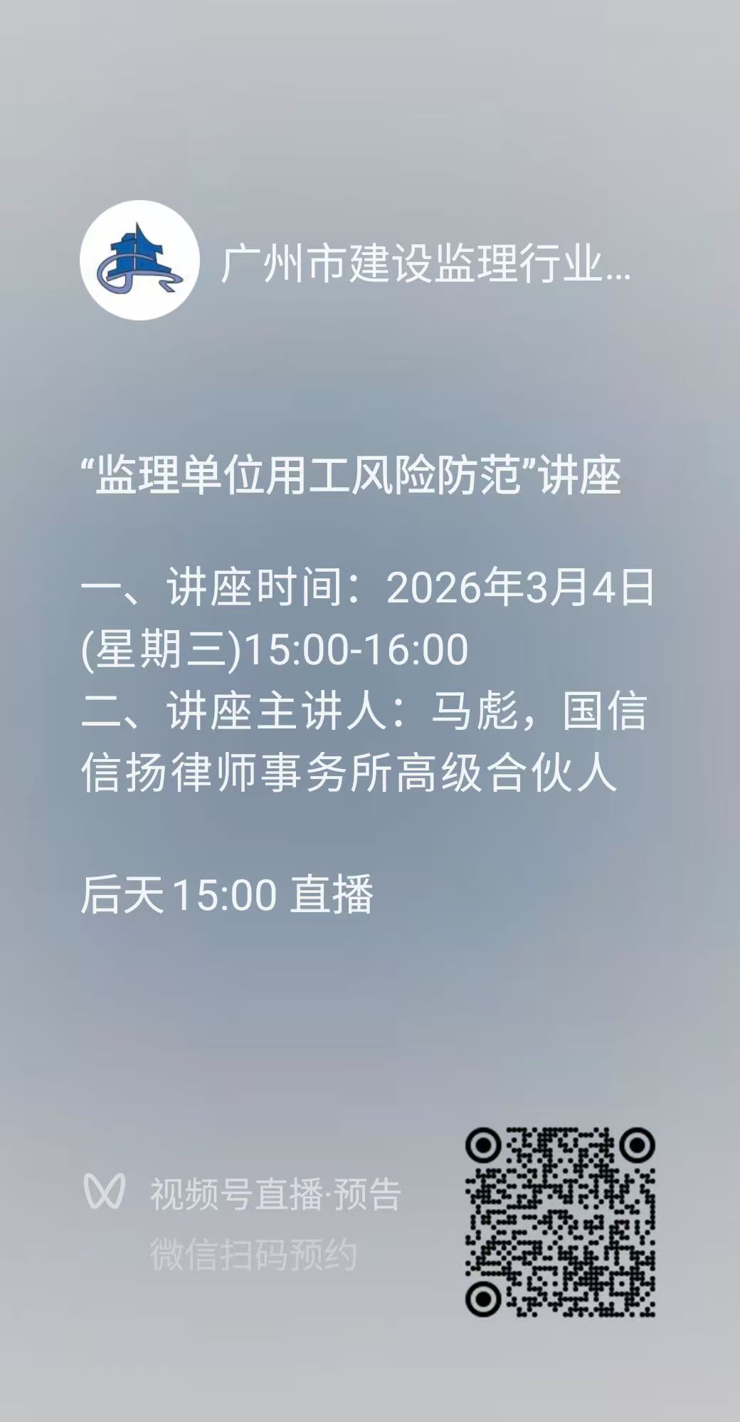 根据《2026年广州市建设监理行业协会专题讲座计划》的相关安排,为进一步提升会员单位在人力资源管理方面的风险防控能力,现定于2026年3月4日举办主题为“监理单位用工风险防范”的专题讲座。本次讲座将系统解析当前监理行业在用工过程中可能面临的法律风险及应对策略,帮助各单位增强合规意识,完善内部管理机制。具体事项安排如下: